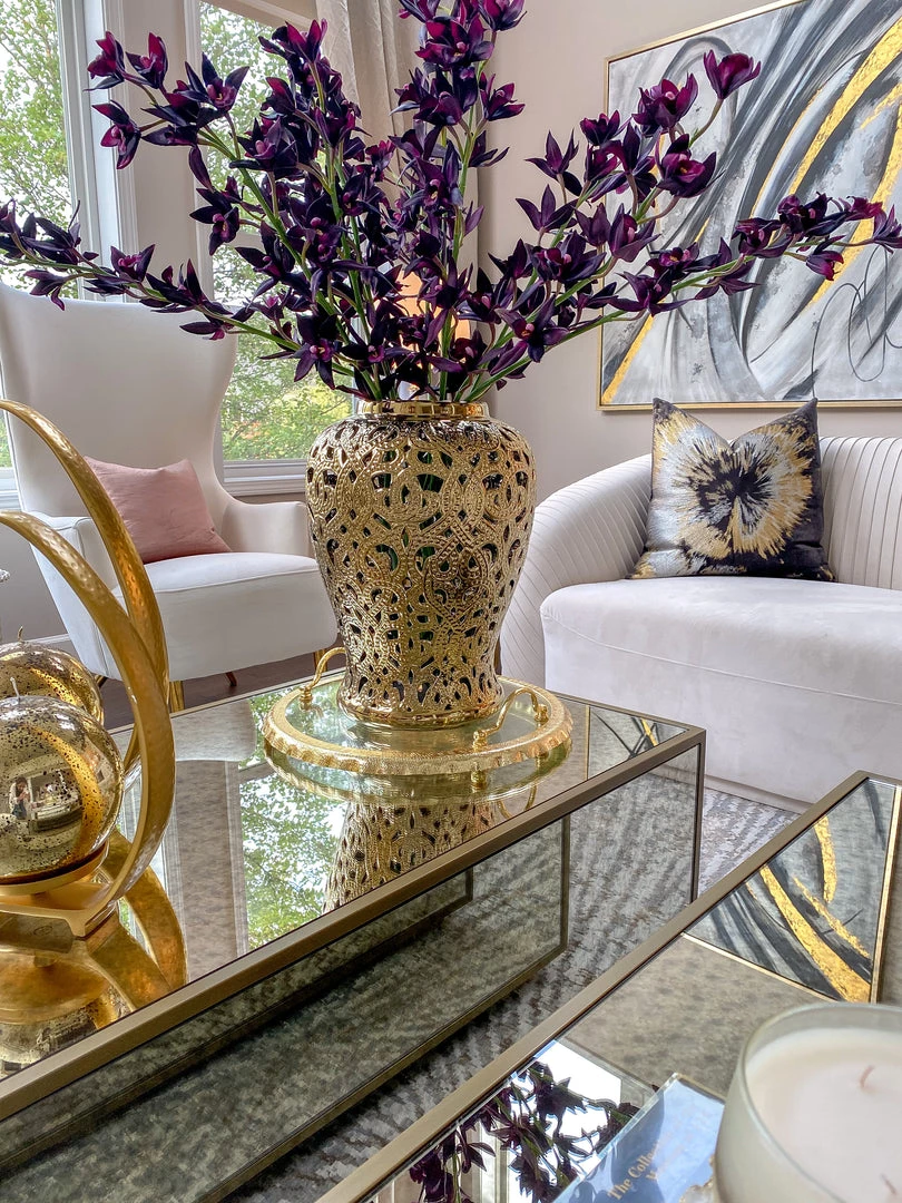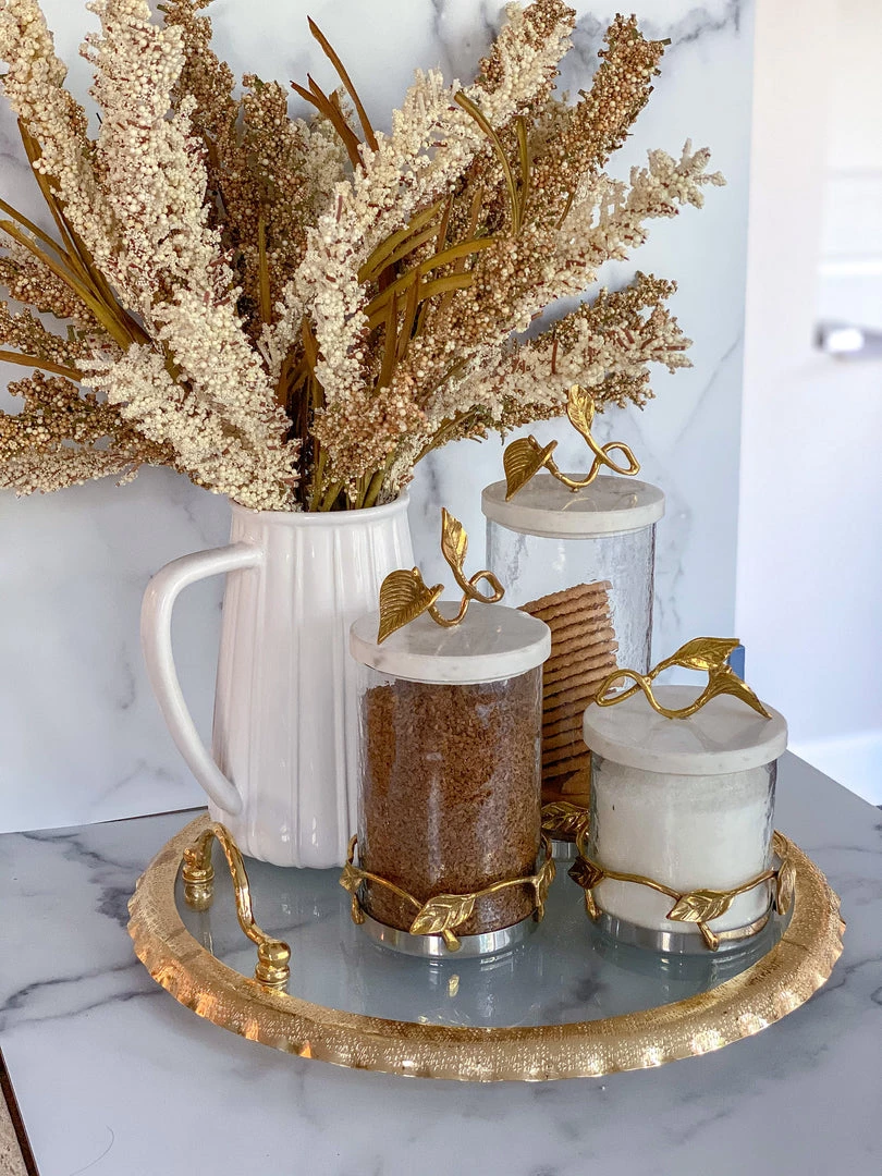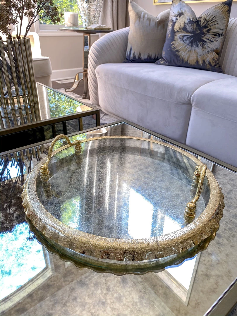 Description: This circle glass tray features gold, textured edging and handles.