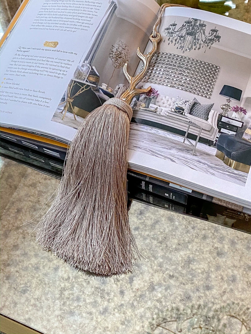 Description: This stunning tassel is a wild and stunning piece! A sleek and silver design is perfect or any display. Wrap it around a vase, sneak it in with your florals, or any other place you want some wild details!