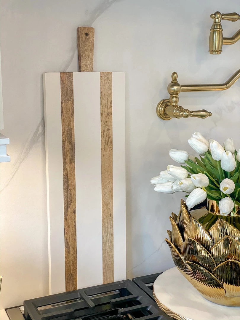 Description: This long wood paddle board features 2 long natural wood stripes and is fun to layer with other wooden boards in your kitchen! You can also use it to display your favorite vases and candles with a beaded strand and have a fun little vignette.