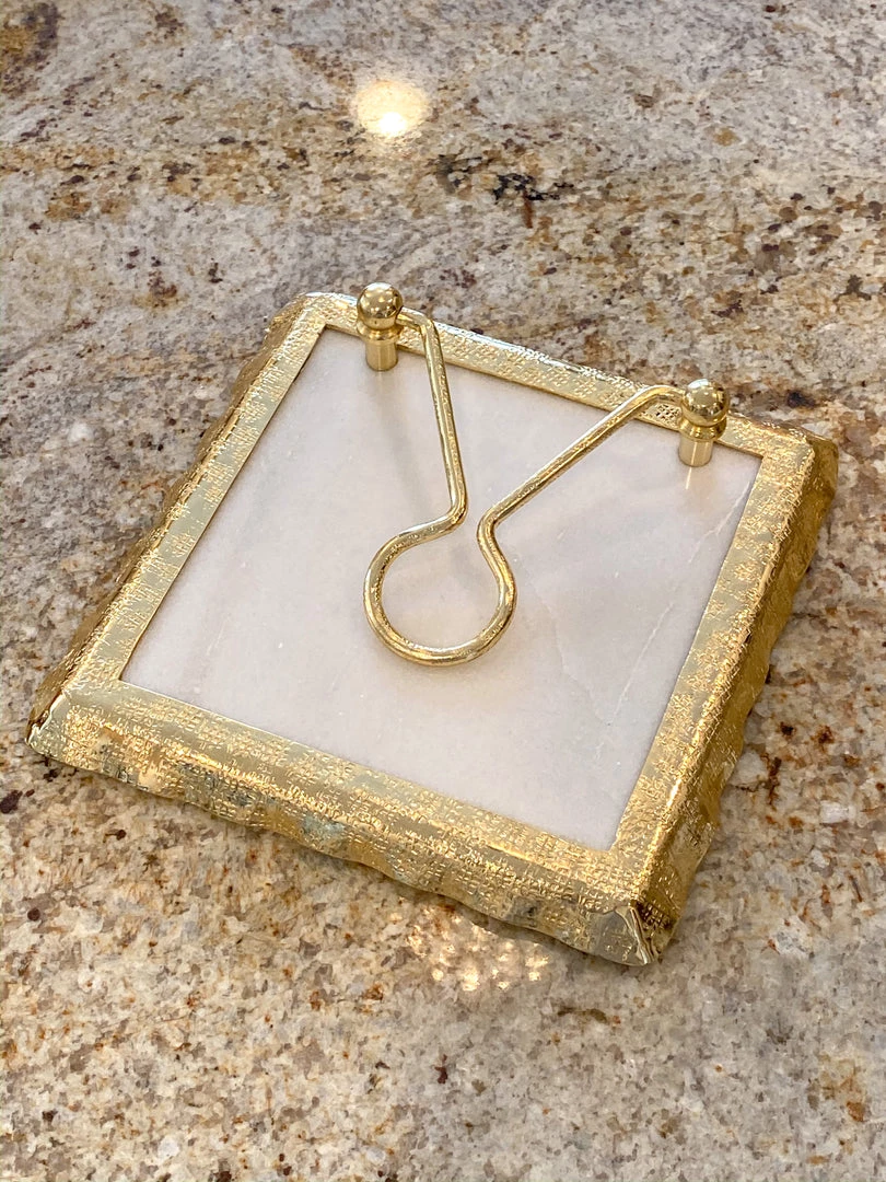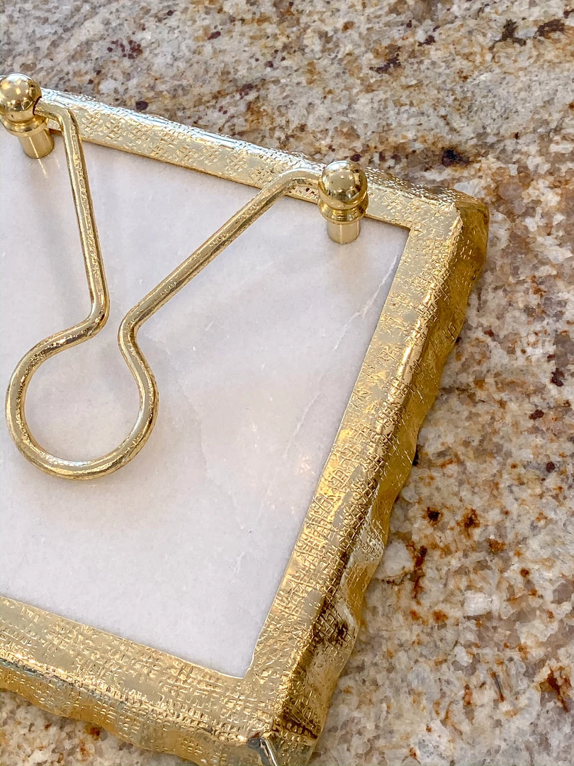 Sleek and elegant marble and gold napkin holder. This piece matches your favorite Marble and Gold Hammered Jars.