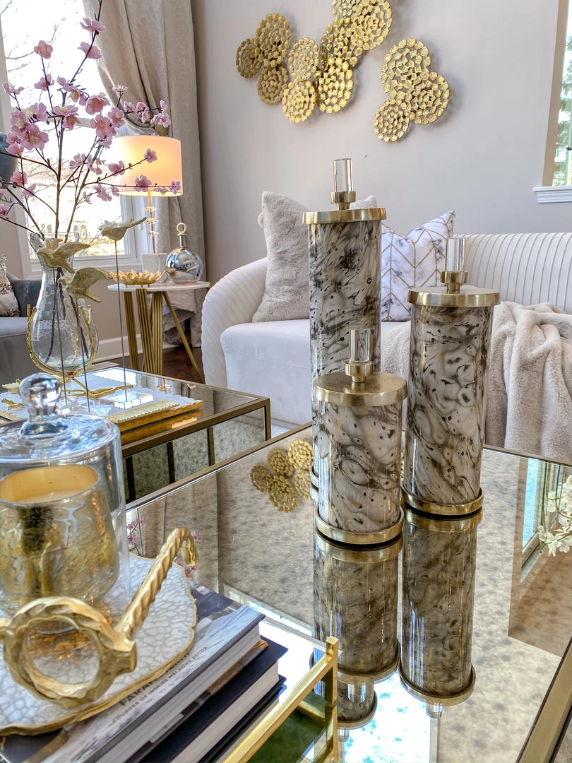 Description: These stunning marbled pattern jars come in three sizes and are a stunning way to bring texture and height to your decor! Perfect for any coffee table. We love the elegant colors that these give off.