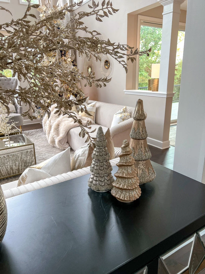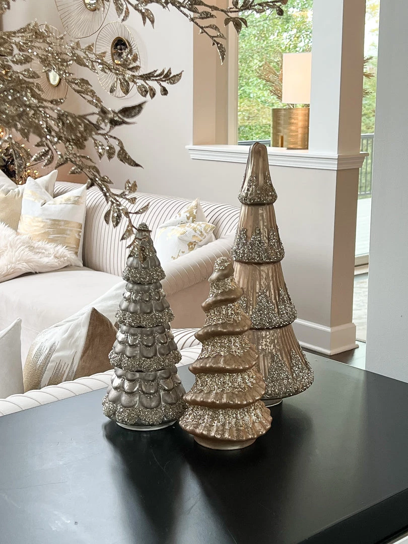 Description: This mercury glass tree with its neutral silver and gold coloring and beautiful glitter finish will instantly elevate any table or shelf as it shimmers in the light effortlessly.