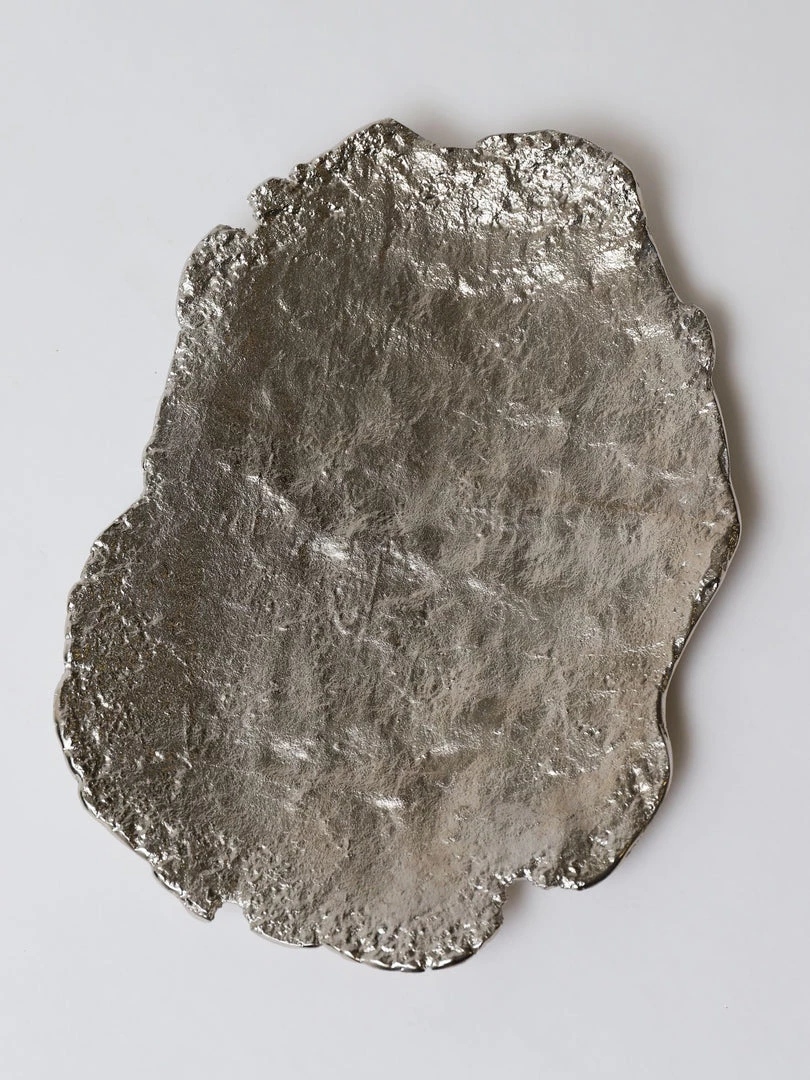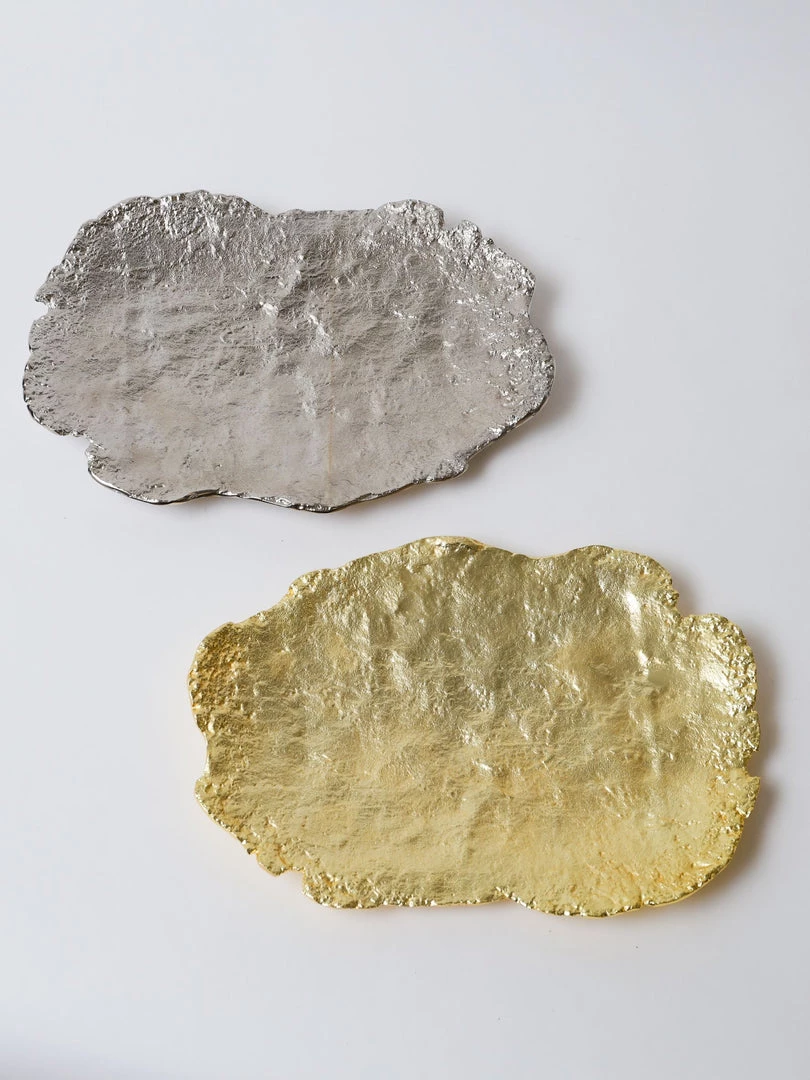 Description: Style your favorite vase, candles or decor on this gorgeous textured rough edge tray for a beautiful vignette. Available in gold and silver.