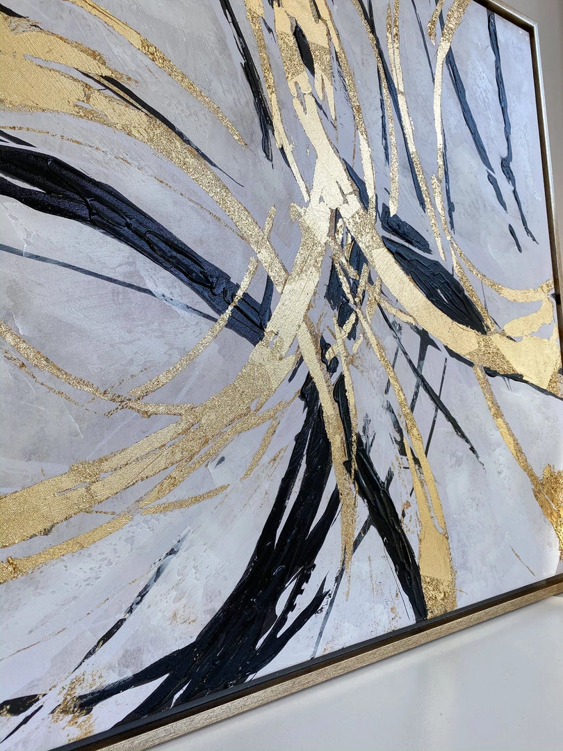 Description: This abstract oil painting has metallic accents of gold, black and gray to add interest to your decor.