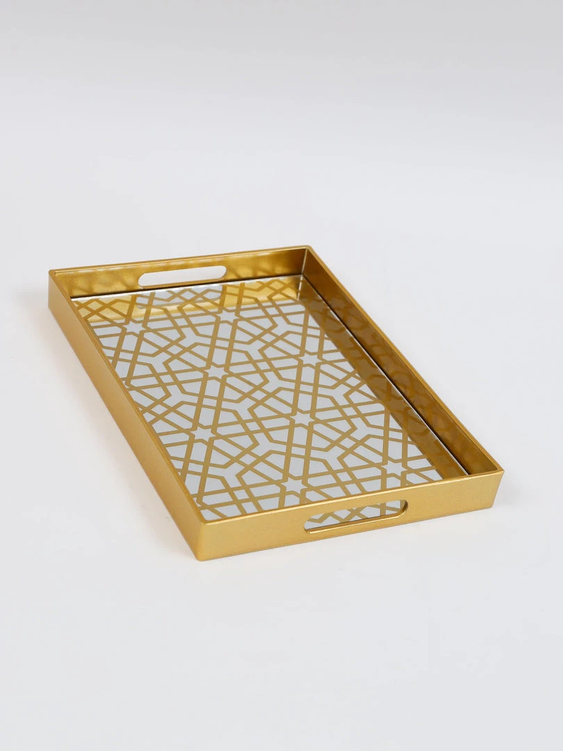 Description: These elegant trays featuring a mirrored glass design with a geometric gold pattern will add some glam to your home. Set of 2.