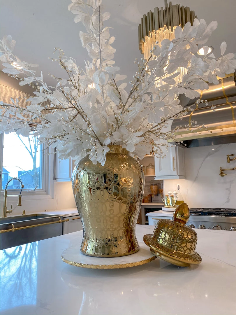Description: This gold ginger jar is a very substantial piece. It stands at 25″ high! This piece is perfect for holding your taller faux floral stems or just to style on its own next to your favorite decor.