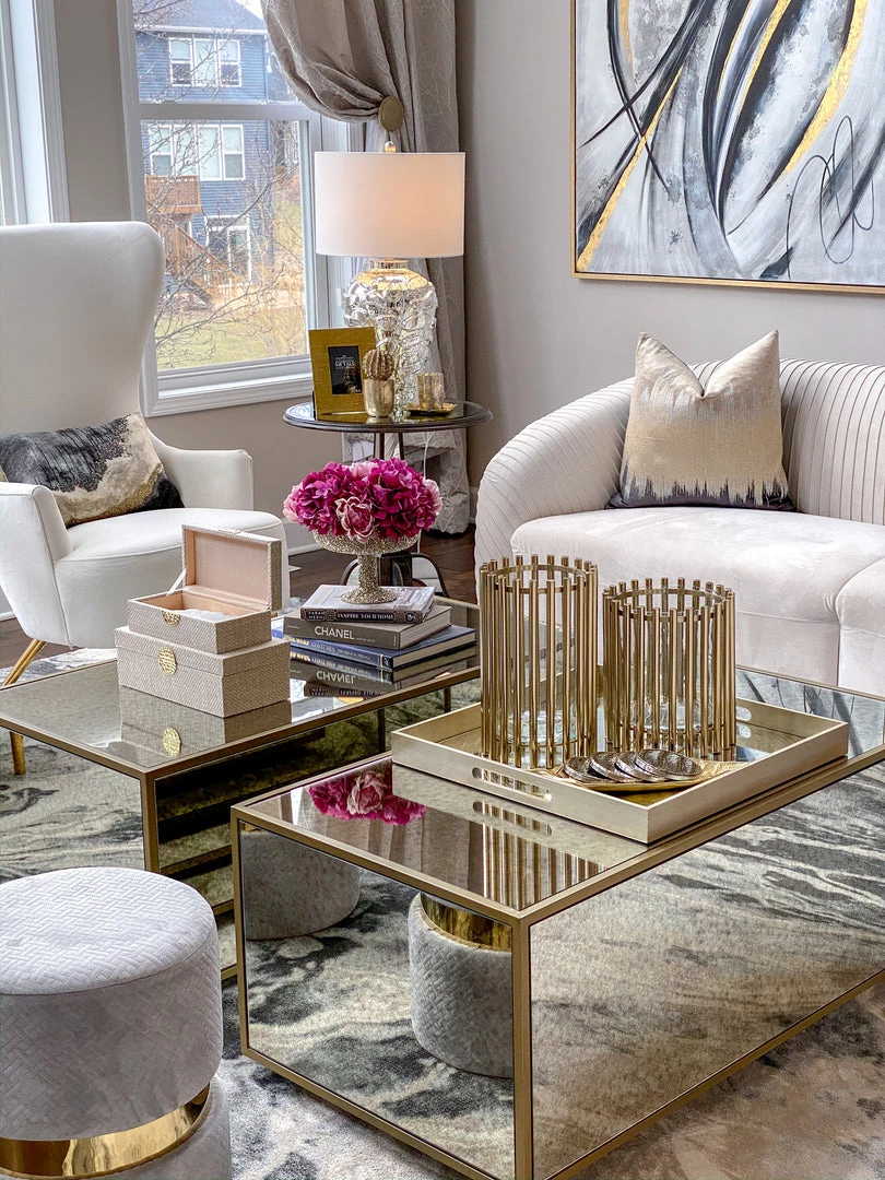 This oversize tray features a mirrored base with a small circle pattern. It is a very substantial piece and is perfect piece for your coffee table