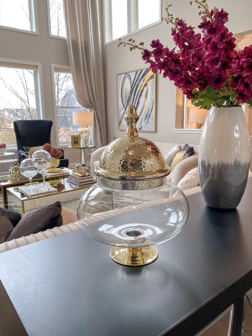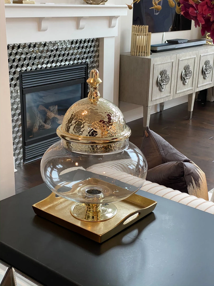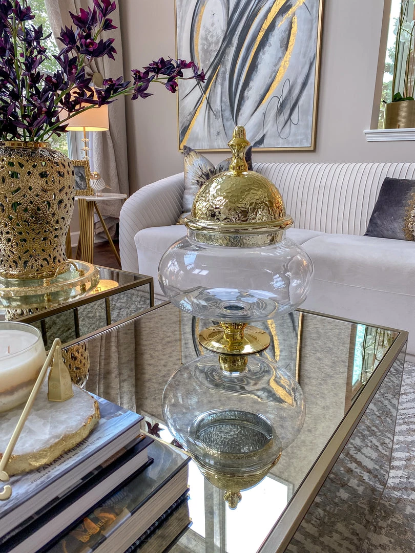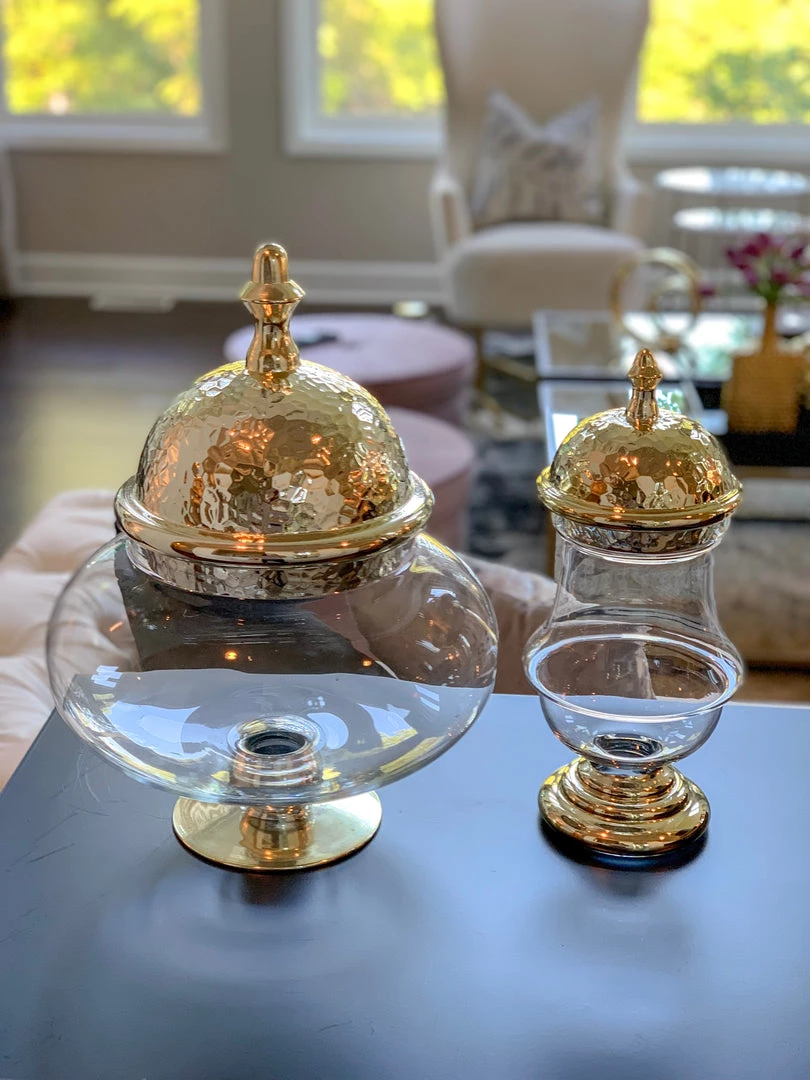 Pictured to the left is this beautiful over-sized Apothecary Jar with an elegant Gold Hammered Lid. Give your family room or any room the classic touch it’s desiring!