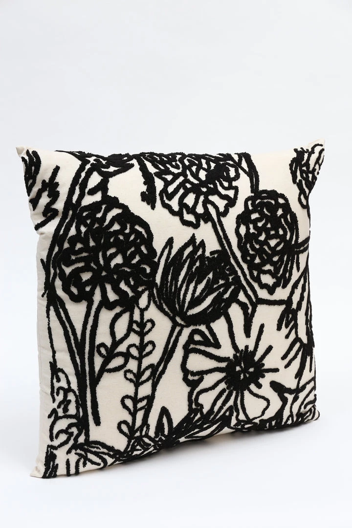 Description: This beautiful pillow features a stunning black floral pattern on a cream background. Perfect for any room to add a dramatic touch!