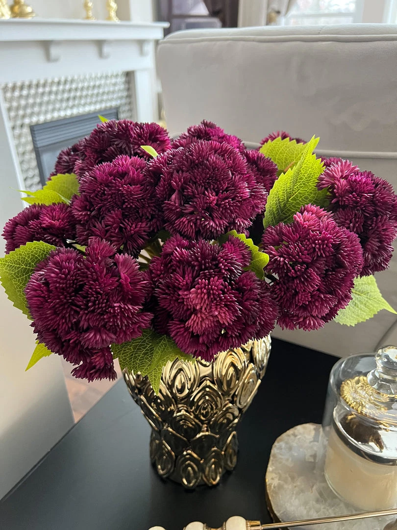 Description: These real touch dramatic purple sedum stems will add a pop of color just in time for Spring! These elegant blooms add an element of texture to any floral arrangement.
