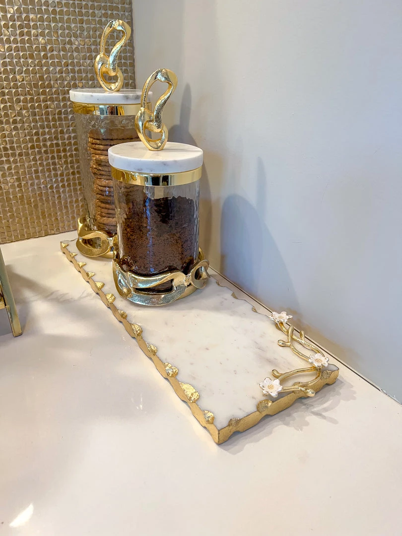 Description: This small rectangular marble tray has stunning gold details with a cherry blossom design! This will look perfect on your coffee station with any style canisters.