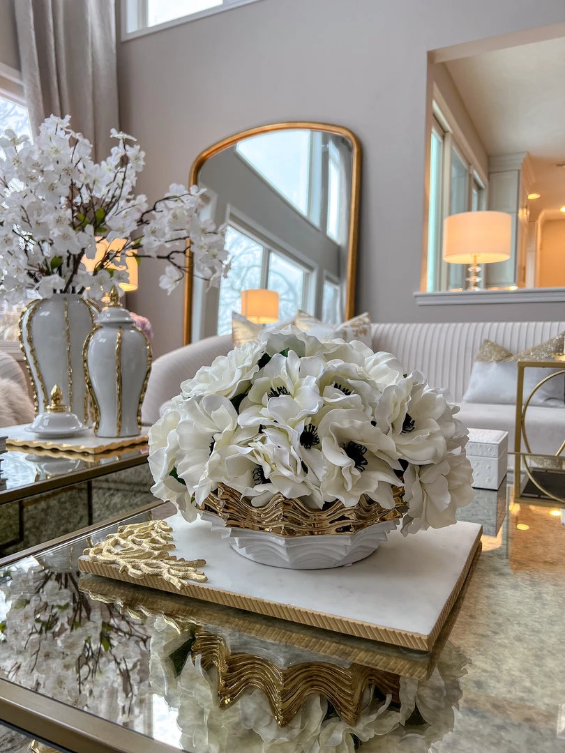 Description: This marble tray features a gold rim and an intricate gold-designed corner. Use this to style your favorite vase and candle, or to add some glam to your coffee table.