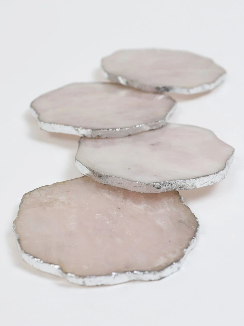 Description: These real quartz coasters have a beautiful distressed gold detail that will add an elegant touch to any surface in your home! They are very large and substantial and are great to layer with trays or candles!