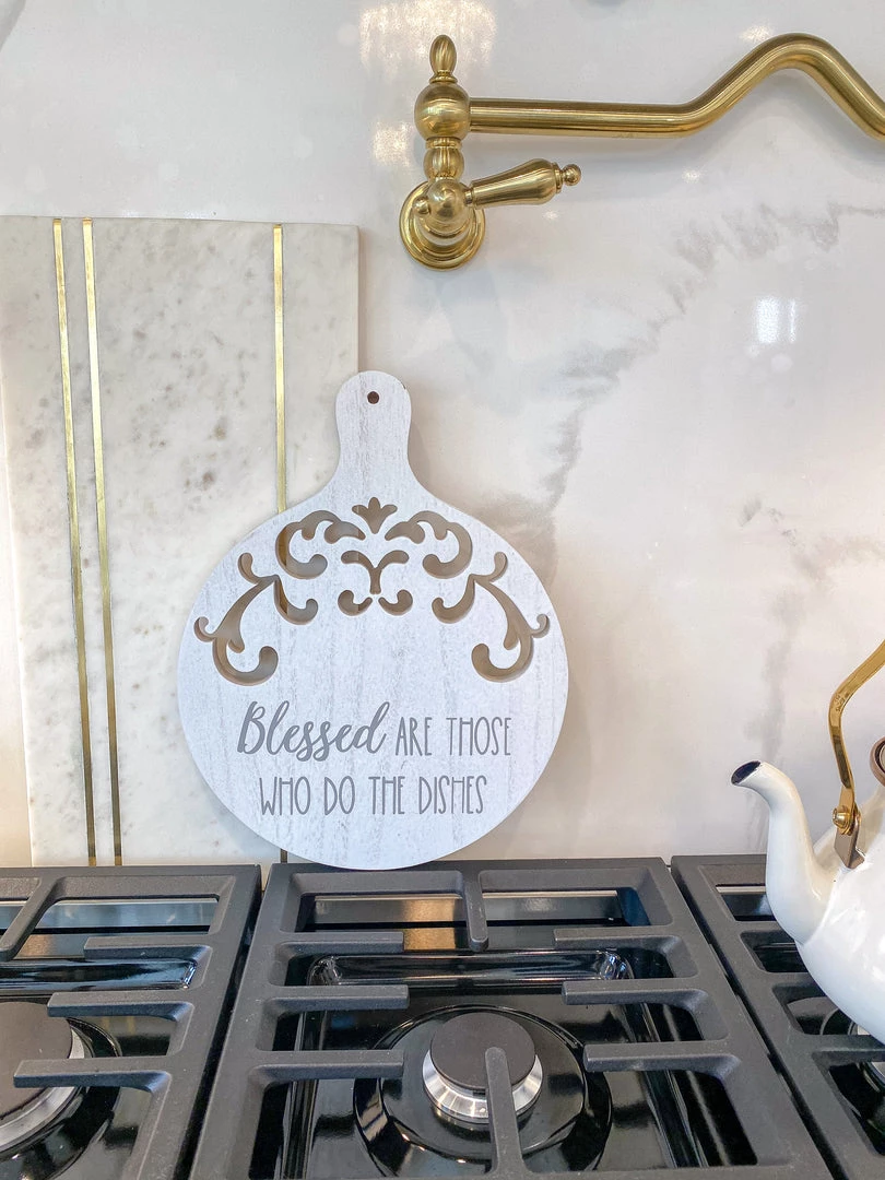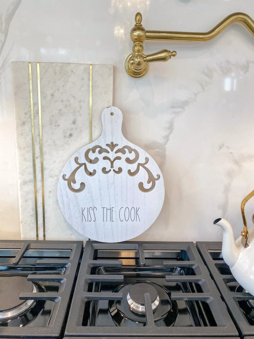 Description: Price For One Piece. These white washed round decorative cutting boards feature cute phrases that are perfect to display in your kitchen. Choose from 3: “Kiss the Cook”, “If I Have to Stir it, It’s Homemade”, and “Blessed are Those Who Do The Dishes”.