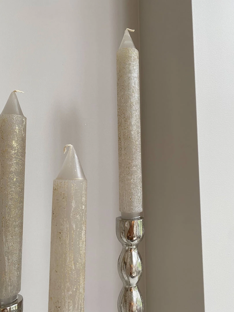 Description: These stunning metallic taper candles will make the perfect addition to your home decor! Featuring shimming flecks of gold, these candles are simple yet very elegant! Available in 4 colors!