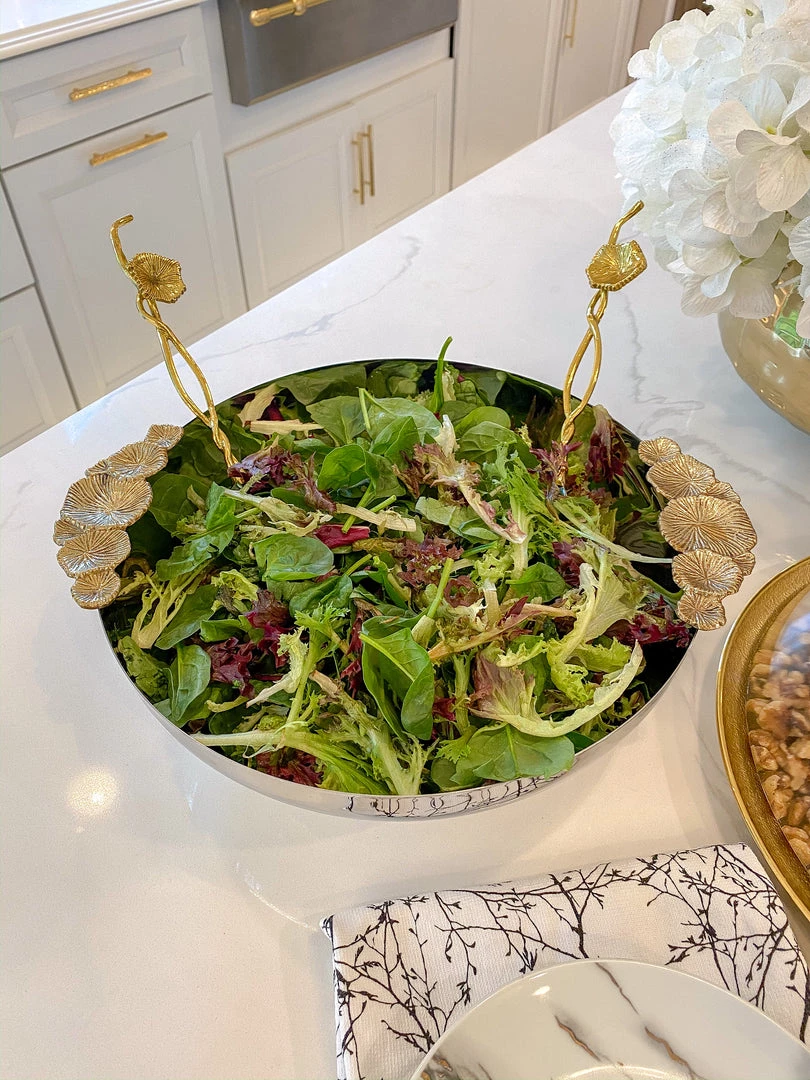 This silver bowl with gold floral handles has reflective silver sheen for an eye-catching display of your favorite snacks or decor.