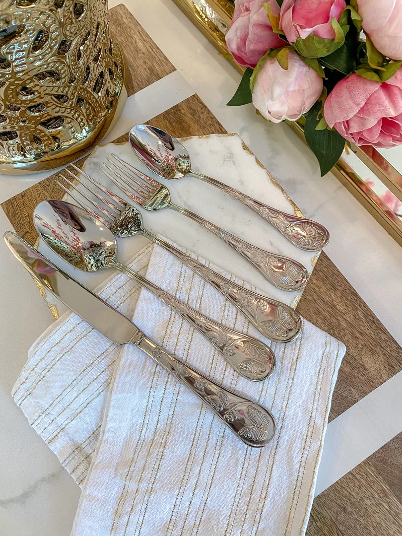 Description: Your dining display just got classier! This beautiful set of silver toned flatware is a beautiful and elegant way to serve your favorite meals! This set features a silver finish with butterfly details! Each set comes with a butter knife, dinner spoon, dessert spoon, dinner fork, and dessert fork.