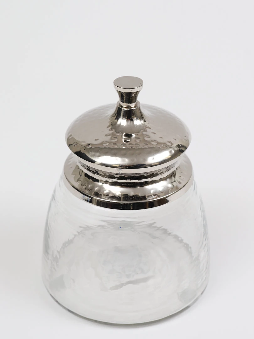 Description: This hammered glass jar with a silver plated lid can be used for so many things. Store your bathroom items or your favorite snacks.