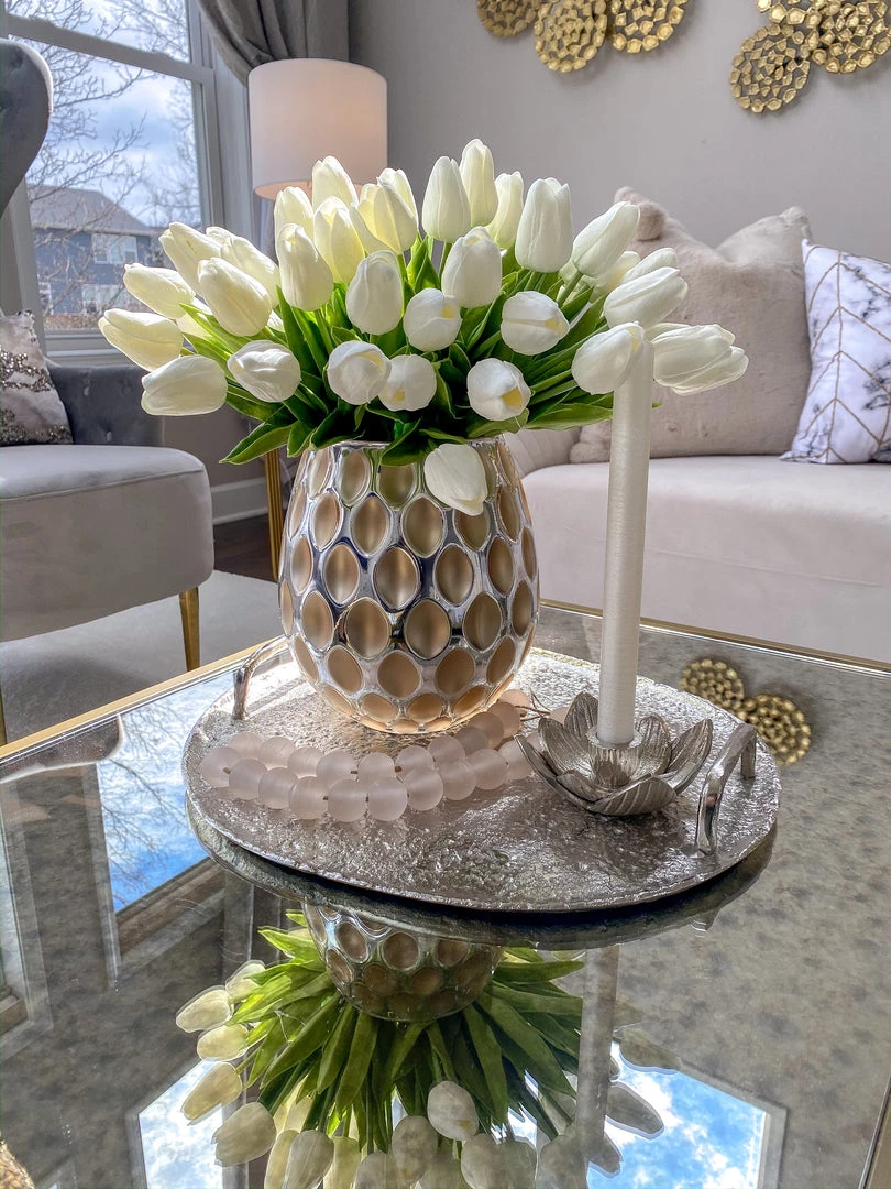Description: This metal lotus candle holder is such a cute addition to any tray in any setting! Add a tapered candle stick and you have an adorable piece! Comes in gold and silver.