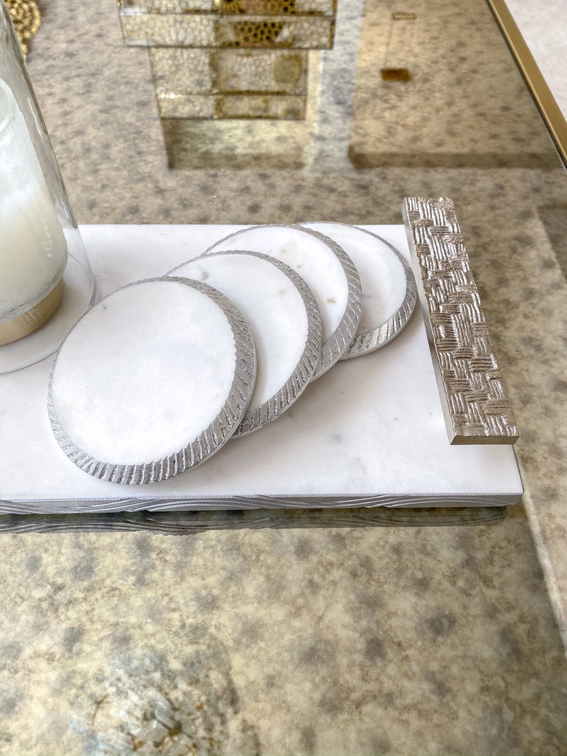 These white marble coasters come with a silver twisted rope edge and can be displayed on any matching tray or on your side or coffee table.