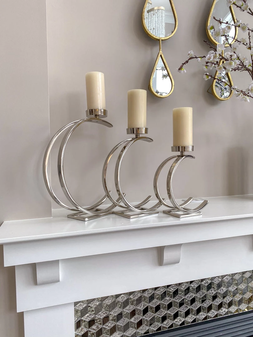 Description: These semi-circular candle holders are a modern yet timeless piece that you can add to any space! Come in small medium and large and we even have them in gold or silver. Sizes and colors sold separately.