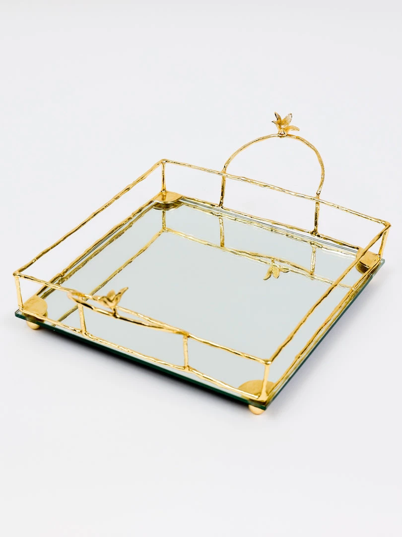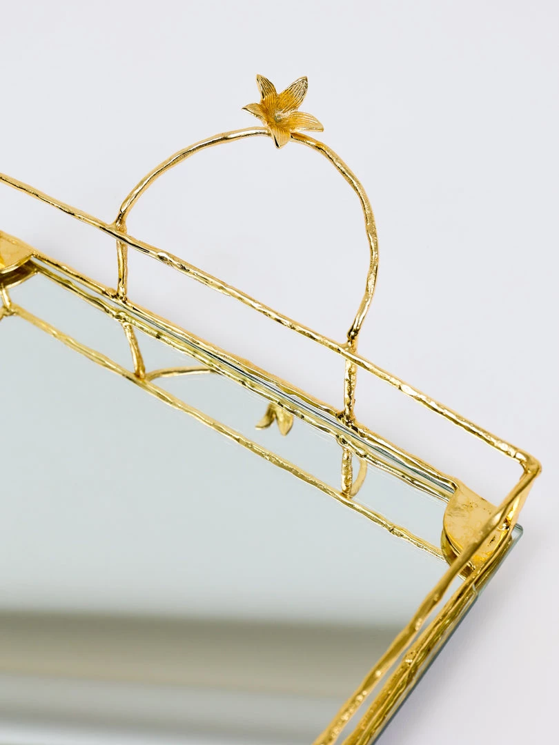 Description: This is a gorgeous square mirrored tray with stunning gold flower details which can be used on a vanity or for layering on your coffee table.