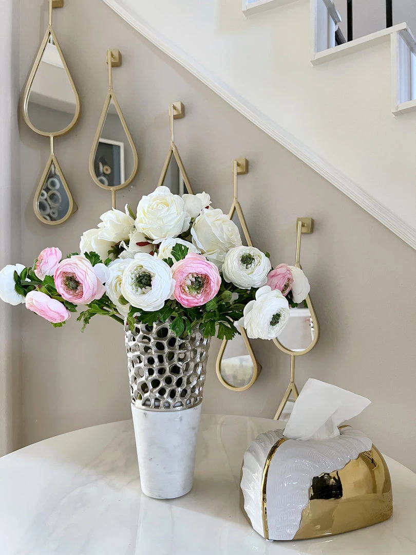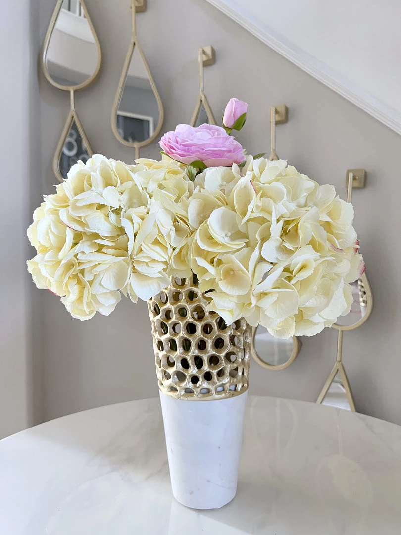 Description: This textured cut-out design vase has a substantial marble base and will look gorgeous with your favorite faux florals.