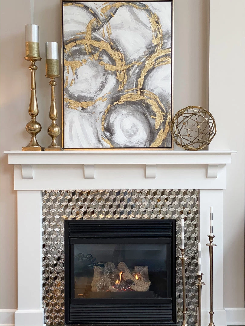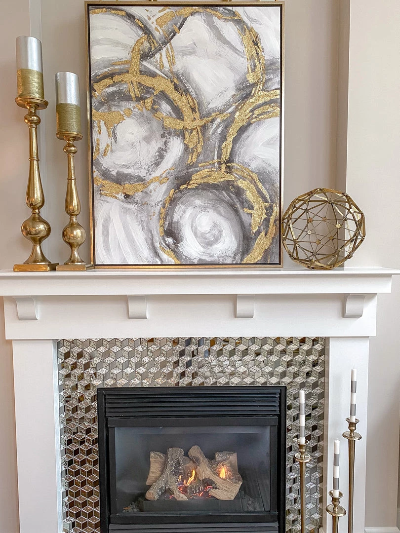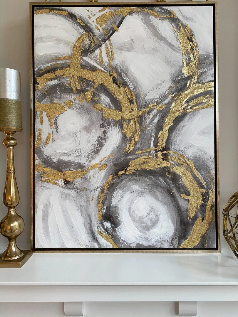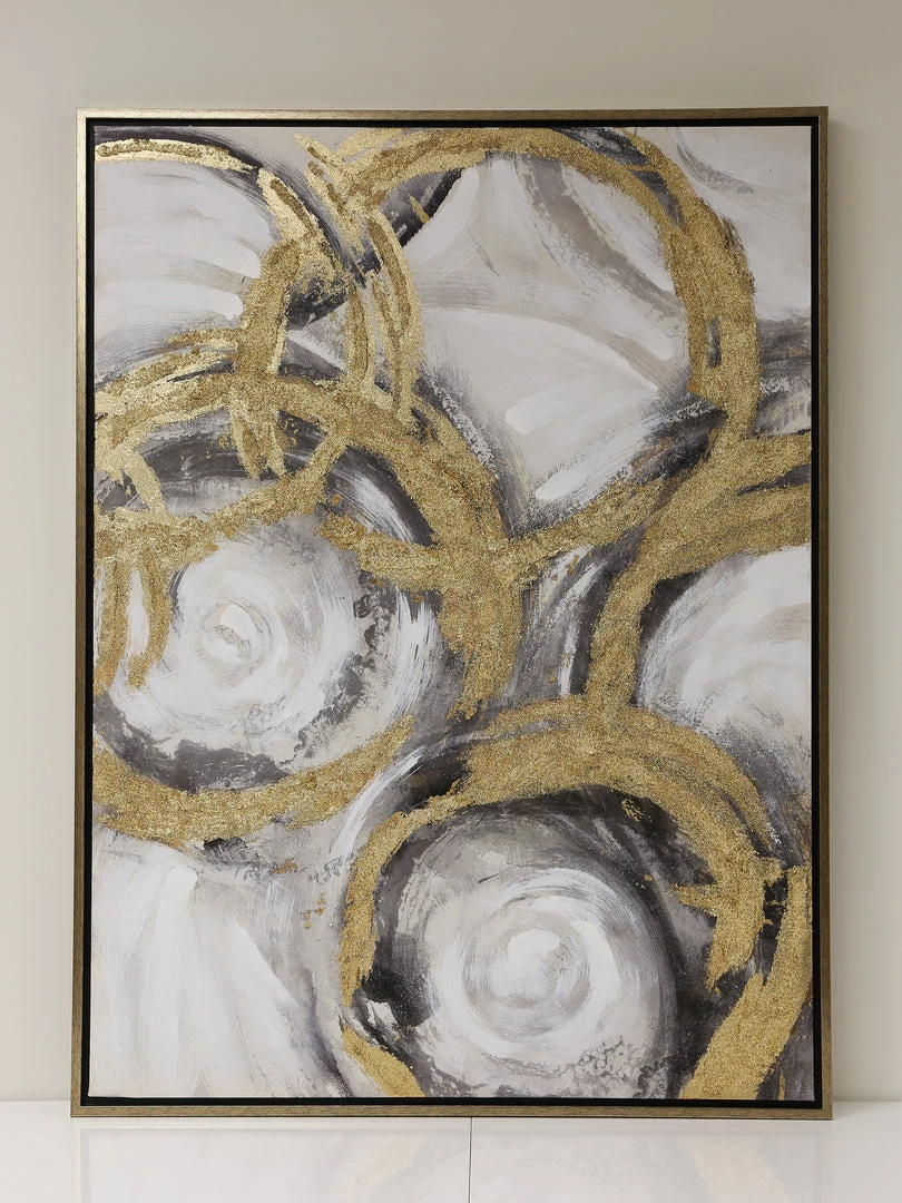 Description: This abstract oil painting has metallic accents of gold, black and gray to add interest to your wall.