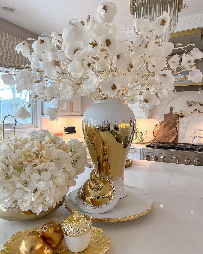 Description: This newest style white and gold ginger jar is a must-have! This sleek style will compliment any other style well.