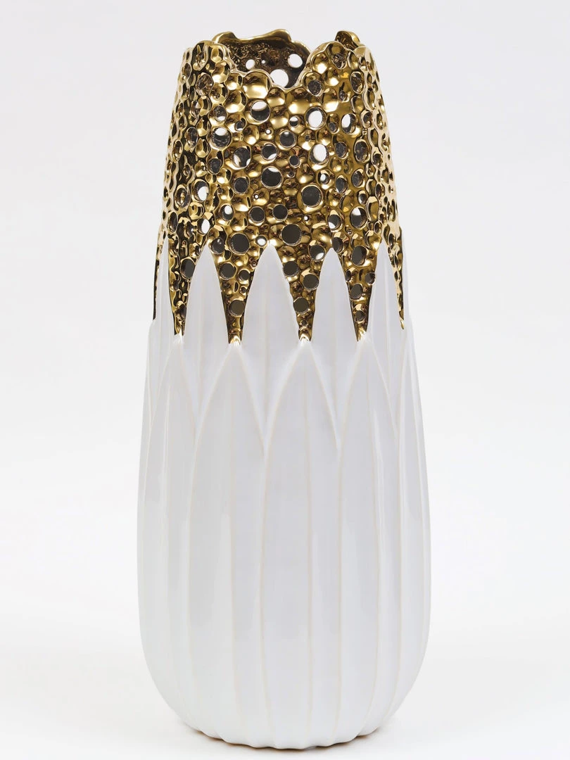Description: This white and gold vase is stunning! We love the gold and white look as well as the open work design!