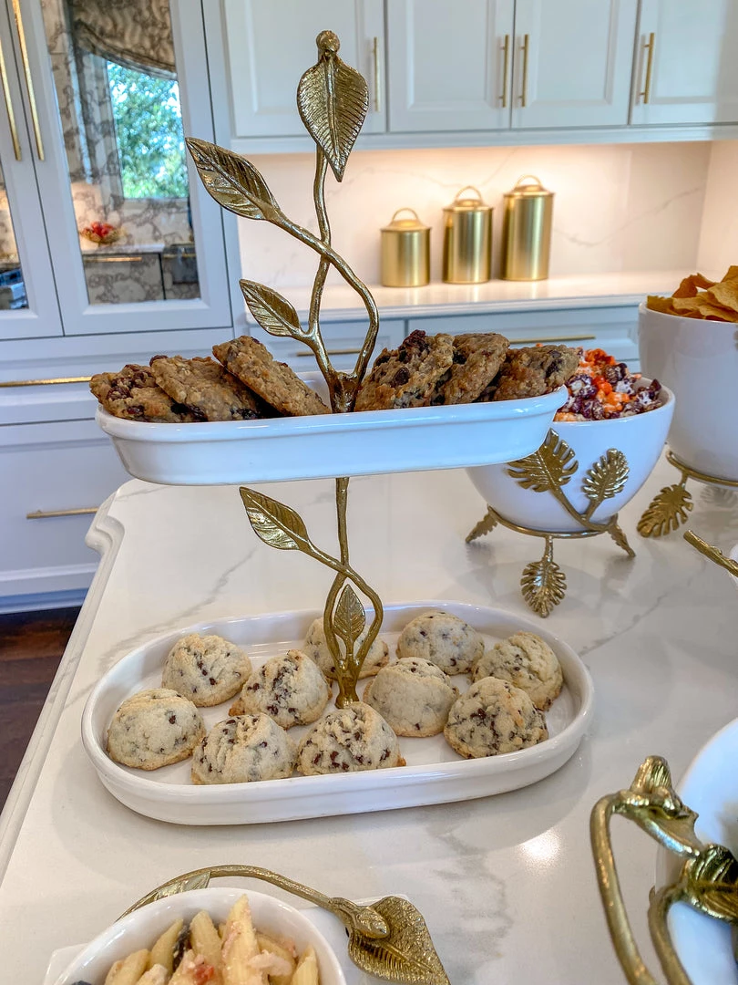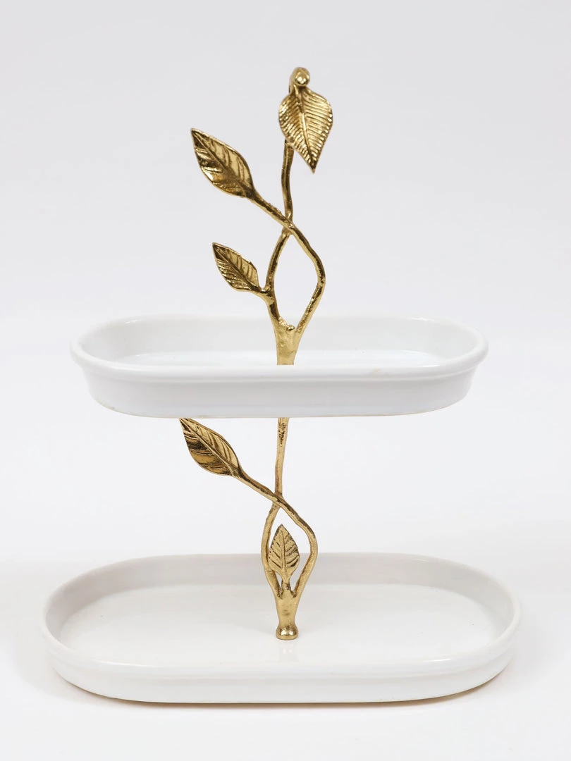 Description: This beautiful two-tiered cake stand is a great piece of elegant design. The gold leaves compliment the glossy white ceramic to create a timeless look of sheer elegance and glam.