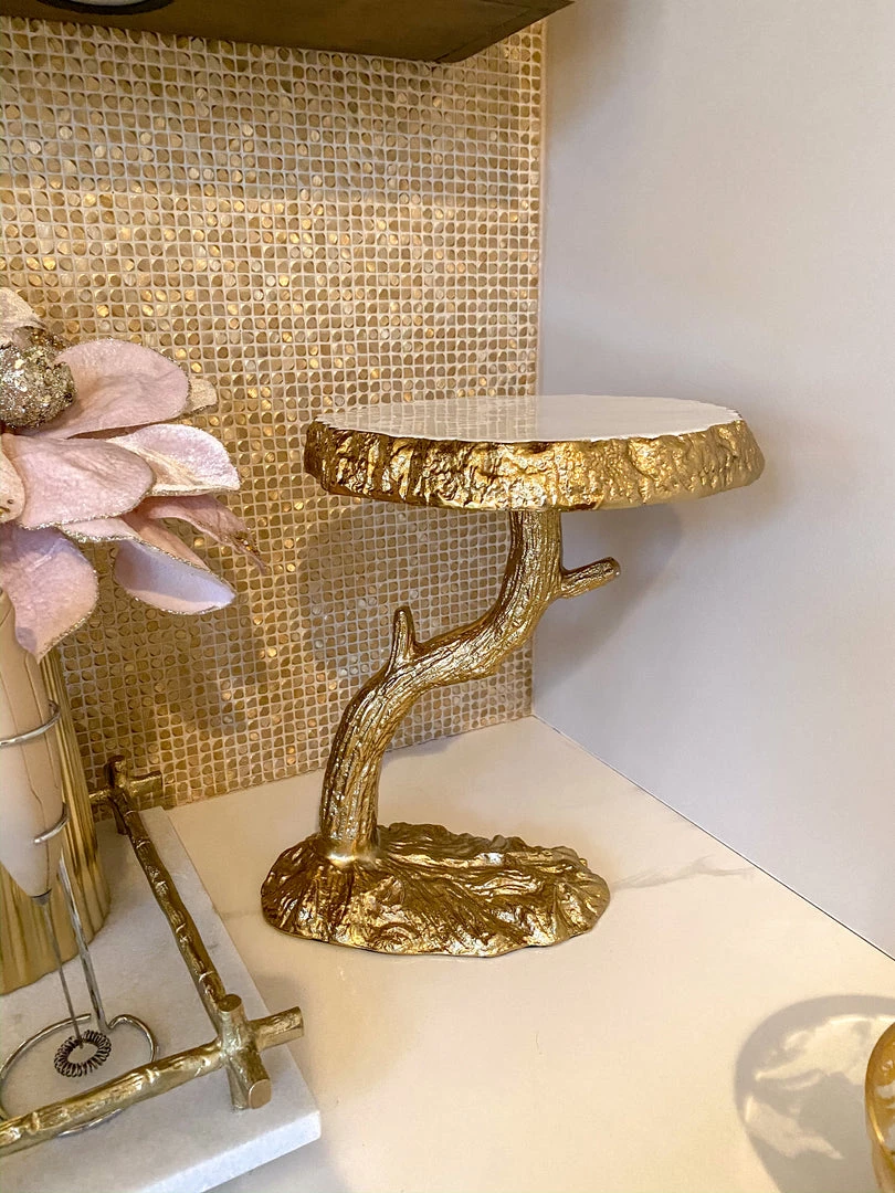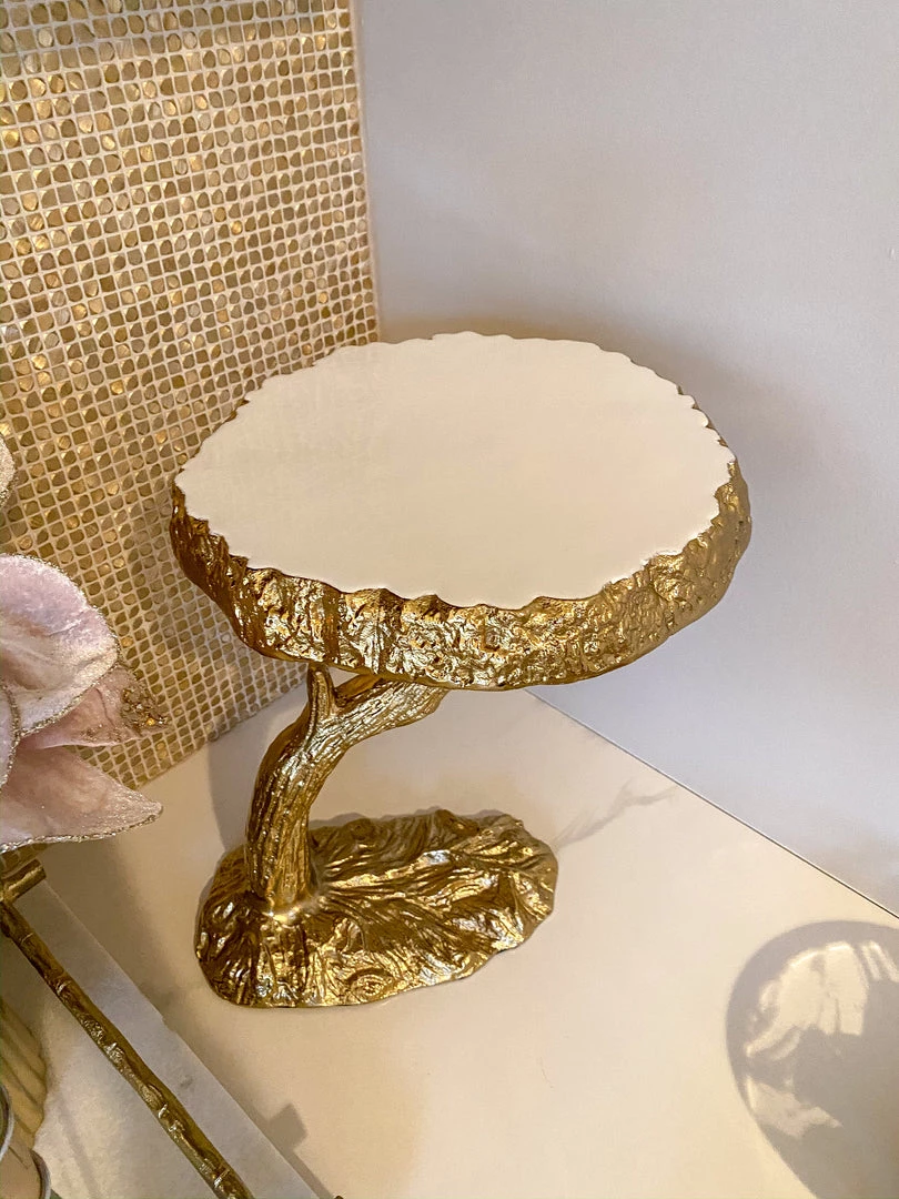Description: Enchant and inspire your guests with this beautiful organic cake stand. The marble tray sit atop a gold tree design and makes a beauitful display for your favorite sweet treats.