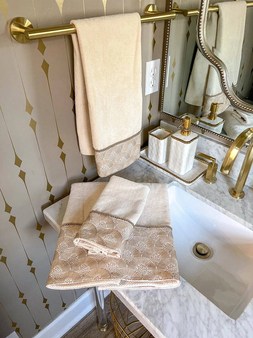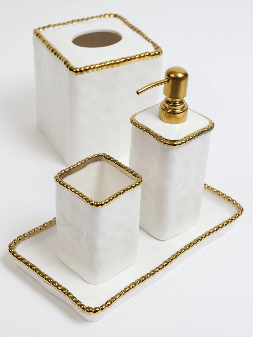 Description: This white and gold titanium beaded vanity collection will add an elegant touch to your bathroom. The collection includes a Soap or Lotion Pump, Rectangular Tray and Toothbrush Holder.