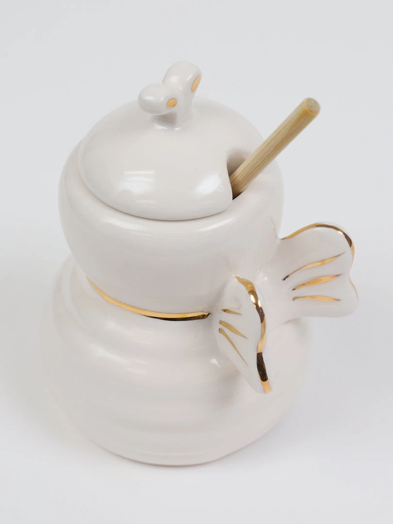 Description: This white ceramic honey bee jar features a wood honey dipper. This is just the cutest honey jar we’ve ever seen.