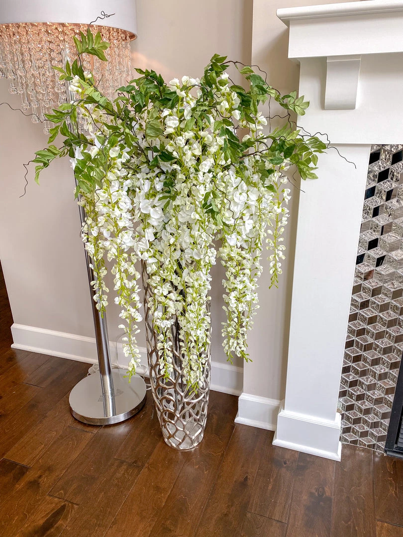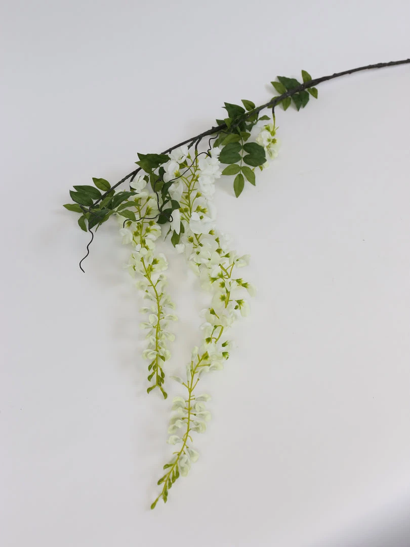 Description: This white wisteria stem is perfect for a large vase with some dazzling florals! The cascading blossoms and delicate leaves will look elegant and beautiful in any room of your home!