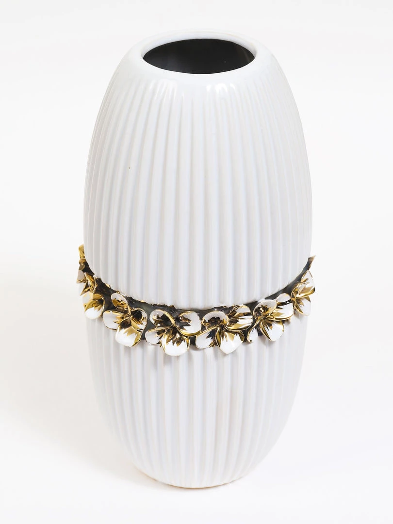 Description: This gorgeous textured ceramic vase features a delicate gold floral stripe through the middle and will make a statement anywhere you place it.