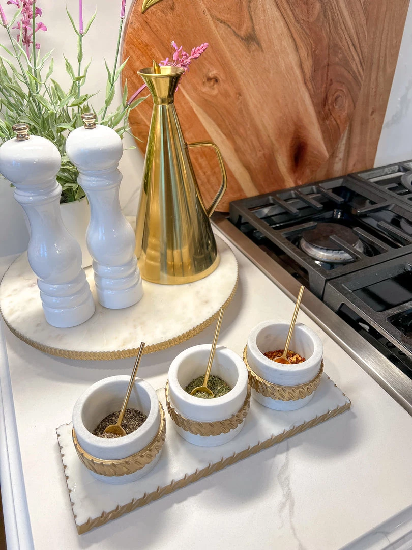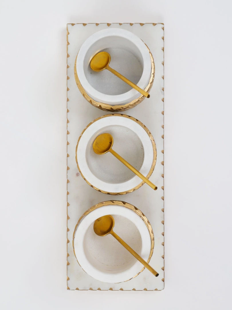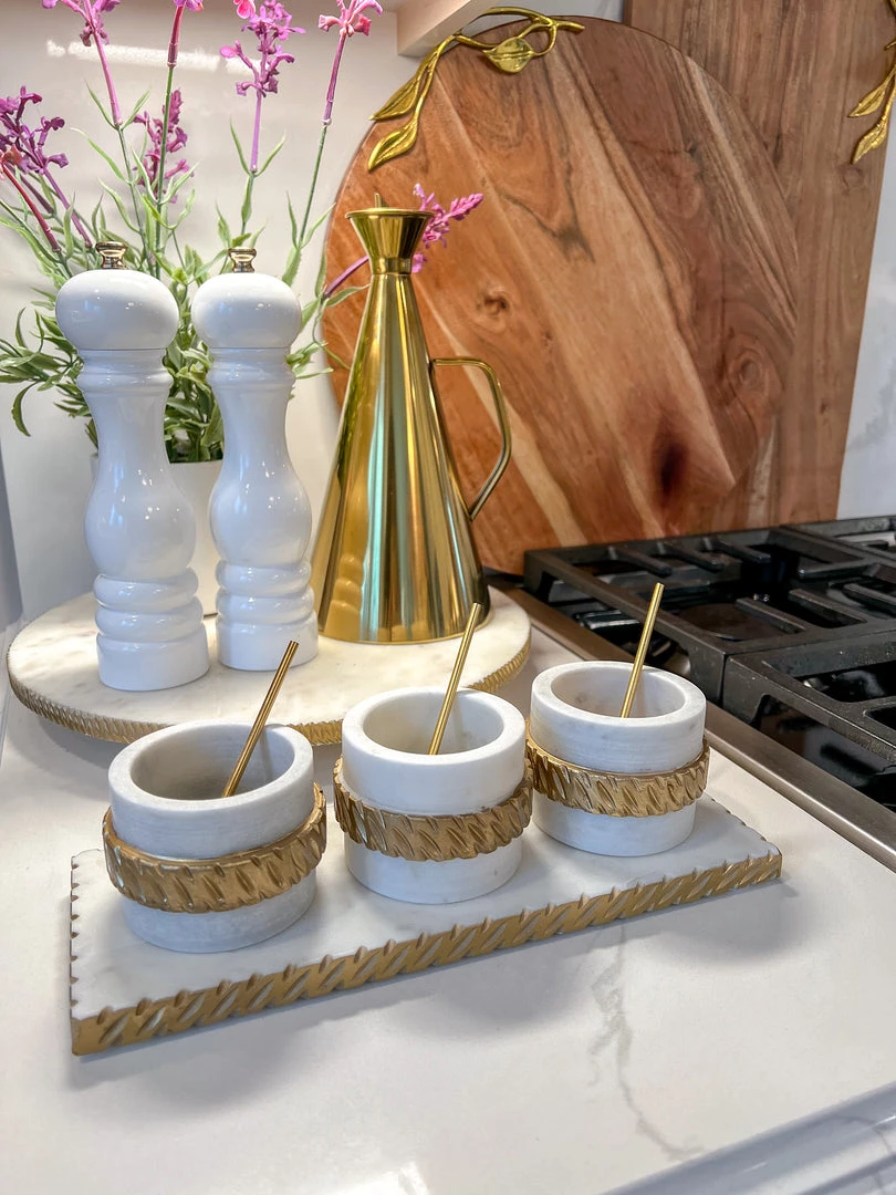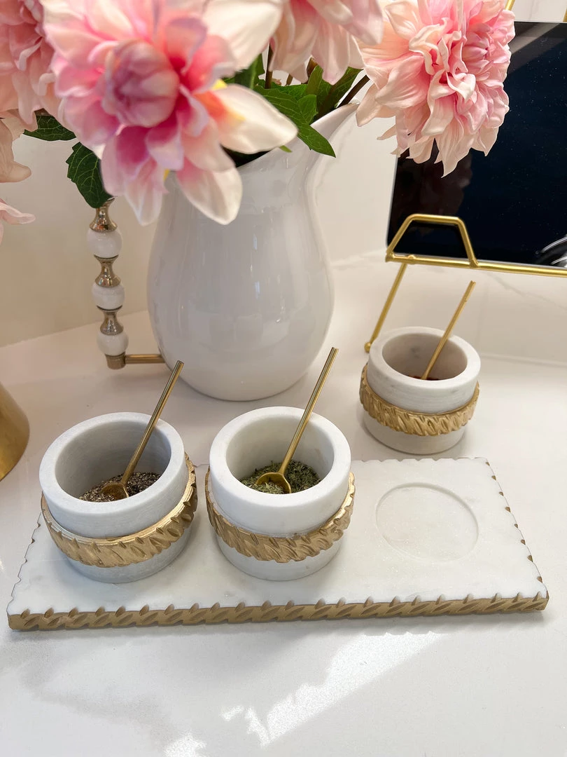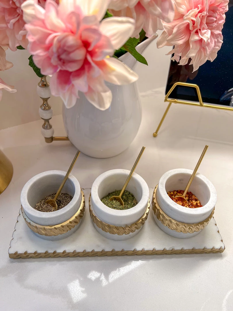 Description: This marble 3 bowl and tray set is perfect to display your favorite spices! It will take your serveware to the next level.