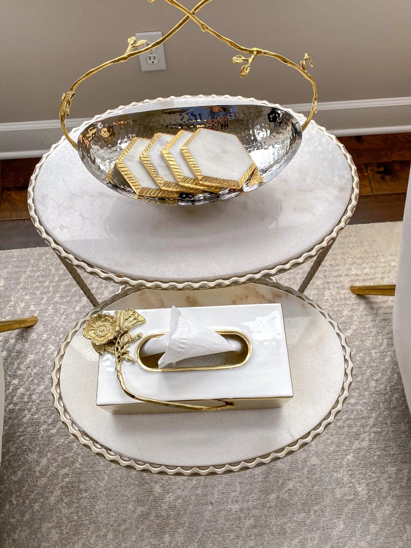 Description: These beautiful white marble hexagon coasters are a perfect accent for your coffee table! Complete with a hammered texture edge and a metallic finish!