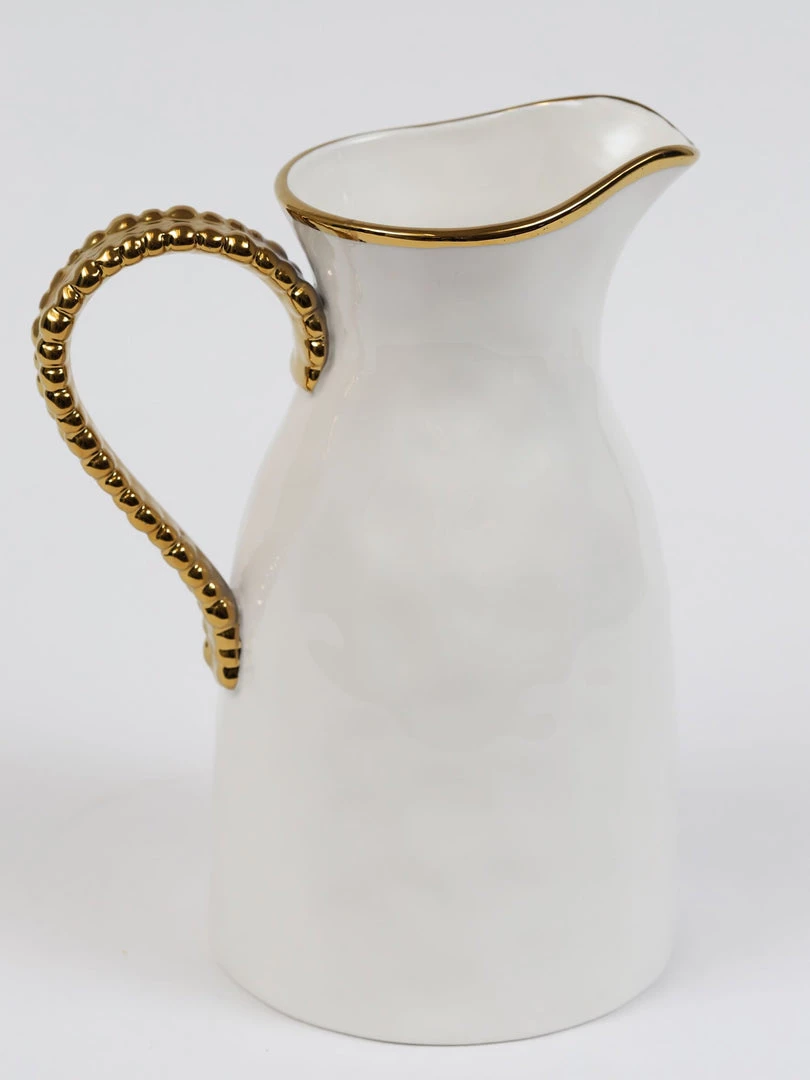 Description: This high quality porcelain is a miracle material! It is food safe, dishwasher safe, and oven safe up to 350 degrees! Made in Argentina, this beautiful porcelain is also tarnish free, scratch/stain resistant, will not lose its beautiful luster, and is perfect for everyday life! Baking and serving never looked so good! The sleek design of this pitcher is beautiful! Th glossy white finish is beautifully accented with a beaded gold handle!