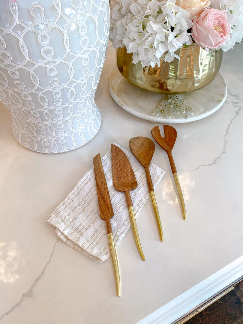 Description: These beautiful wood servers feature gold metal handles to add stunning sophistication to your serving sets!