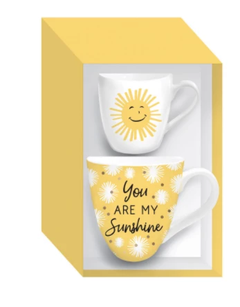 Description: This mug gift set is perfect for new mothers and more. The cups read: “You are my sunshine” in yellow in the 17 oz. larger mug and a sun simile face for the 7 oz. smaller one.